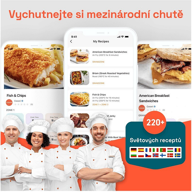 Fritéza Cosori Turbo Tower Pro byla navržena v Kalifornii a na jejím vývoji pracoval také tým Cosori kuchařů. V aplikaci najdete přes 200 mezinárodních receptů, které můžete díky jednoduchosti přípravy jídla ve fritéze jednoduše připravit svým blízkým.