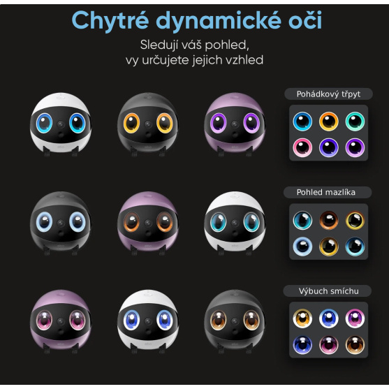 Dva digitální displeje nahrazující oči dodávají EBO Air 2 Plus osobnost a emoce. Uživatelé si mohou nastavit barvu, styl i animace, čímž přizpůsobí vzhled robota své náladě nebo prostředí. Oči reagují na různé situace – například při hovoru, nabíjení nebo pohybu – a vytvářejí živý, přátelský dojem. Díky tomu působí EBO Air 2 Plus nejen jako chytrý přístroj, ale jako skutečný člen domácnosti.
