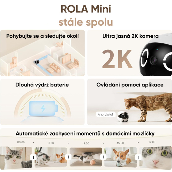 Kamera s rozlišením 2K a širokým zorným úhlem 137° zachytí každý důležitý moment, zatímco obousměrný zvuk umožní mluvit se zvířetem nebo třeba s dětmi doma. ROLA Mini zvládá i vzdálené videohovory – stačí jediné klepnutí v aplikaci a můžete se spojit s kýmkoli, kdo má robota připojeného. Díky vysokokapacitní baterii 5000 mAh robot funguje zcela samostatně, až 25 dní. Jeho odolná konstrukce a pohyblivost zaručují, že zvládne i hravé nárazy nebo nečekané překážky.