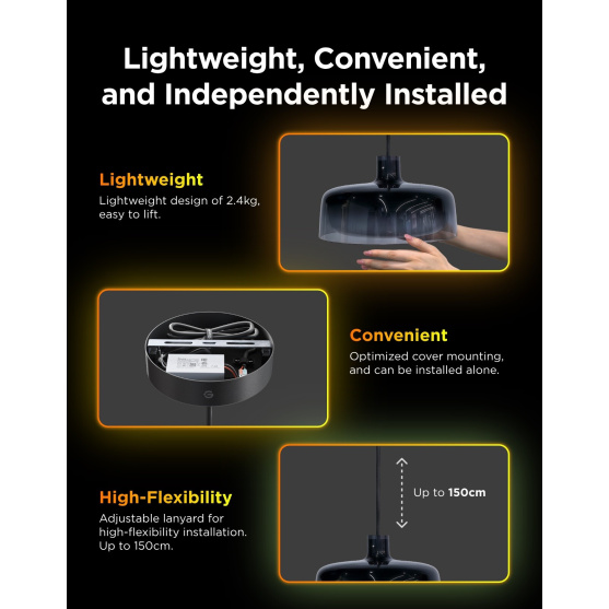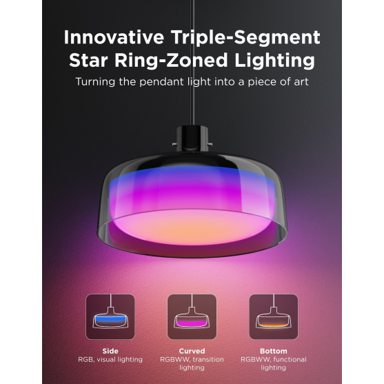 Govee Pendant Light je vybaven třístupňovým kruhovým osvětlením, které poskytuje 360° osvětlení s možností nezávislého ovládání každé zóny. Světlo je nastavitelné od teplé bílé 2700 K po studenou 6500 K a nabízí vysoký index podání barev (CRI 95). Instalace lustru je jednoduchá a díky nastavitelnému závěsnému kabelu až 150 cm si jej snadno přizpůsobíte výšce svého stropu.