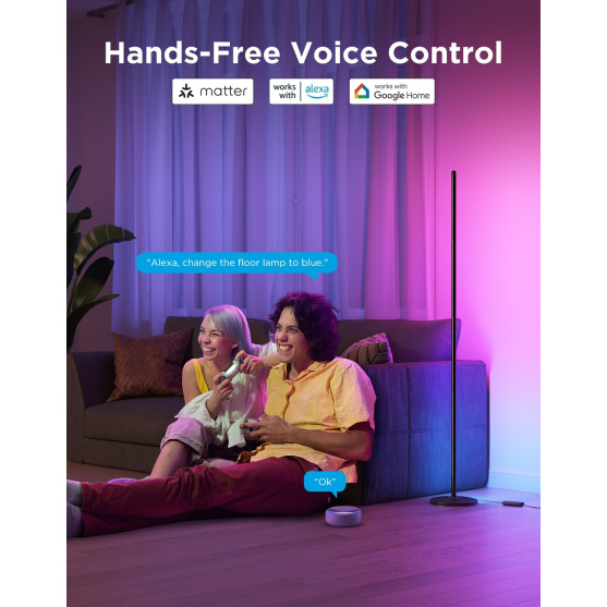 Lampička Govee Smart Corner Floor Lamp je kompatibilní s asistenty Alexa, Google Assistant a Siri. Nyní můžete Govee Smart Corner Floor Lamp zapnout/vypnout, upravit úrovně jasu nebo změnit jejich barvu pomocí hlasových příkazů z pohodlí své pohovky nebo postele. Ovládat lampu je možné také přímo na panelu nebo přes aplikaci ve vašem smartphonu nebo tabletu.