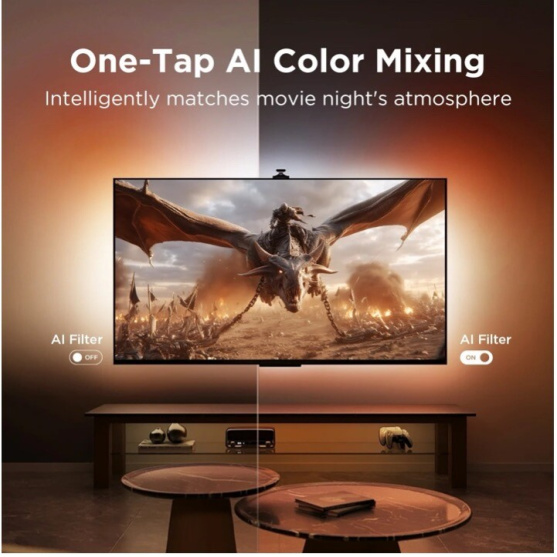 Pokročilé AI algoritmy analyzují obraz v reálném čase a okamžitě přizpůsobují barvy okolnímu osvětlení. Systém se dokáže učit z obsahu a přináší tak inteligentní a dynamické efekty. Výsledkem je zážitek, který se přizpůsobí každé scéně přesně podle její atmosféry.
