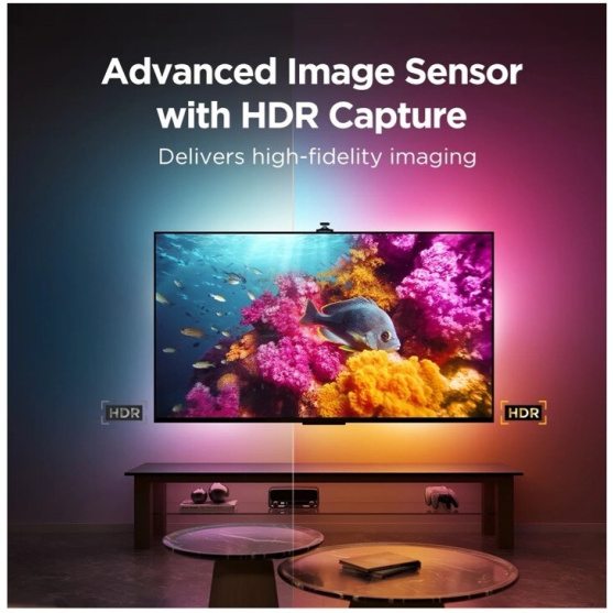 Pokročilý hardware zajišťuje dokonalý obraz i světlo. Tři kamery HDR snímají obsah v kvalitě 1080p/30fps a přenášejí barvy na vysoce hustý LED pásek (75 LED na metr) v reálném čase. Vícezónová kalibrace a duální expoziční algoritmus zaručují přesné zachycení kontrastů a detailů po celé obrazovce. Díky 16bitovým RGBWWIC čipům a technologii LuminBlend™ dosahuje podsvícení o 30 % vyššího jasu a věrnější reprodukce barev. Výsledkem je dokonalé sladění mezi děním na obrazovce a osvětlením, které vás vtáhne přímo do děje.