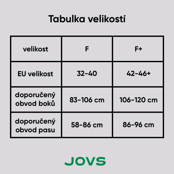 Šortky jsou dostupné ve dvou velikostech: F a F+. Správnou velikost si snadno vyberete podle naší tabulky.