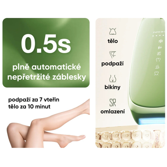 JOVS Scroll nabízí čtyři inteligentní režimy – tělo, podpaží, bikini a SR omlazení pokožky – které automaticky upravují intenzitu světla podle citlivosti jednotlivých partií. Díky tomu je používání maximálně efektivní a bezpečné pro celé tělo, od jemné pokožky podpaží až po citlivé oblasti. Při pravidelném používání přináší přístroj prokazatelné výsledky – až 95,8% redukci chloupků už po 4 týdnech. Každé ošetření tak vede nejen k hladší pokožce, ale i k dlouhodobému zpomalení růstu nových chloupků.