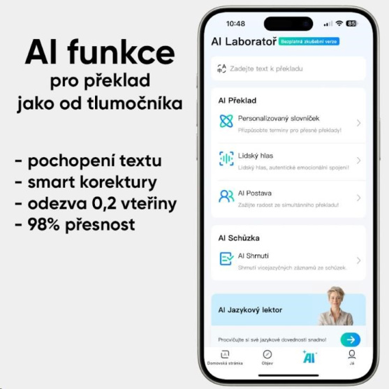 Překonejte jazykové bariéry v reálném čase s AI tlumočníkem a překladatelem Timekettle W4. Podporuje obousměrný překlad ve 42 jazycích a 95 dialektech, takže konverzace mezi různými kulturami je plynulá a přirozená. Ať už cestujete, pracujete nebo poznáváte nové lidi, W4 zajistí, že každé slovo bude správně pochopeno. Rozlučte se s trapnými pauzami a jazykovými nedorozuměními – stačí mluvit a AI se postará o zbytek. Komunikujte svobodně a sebevědomě kdekoliv na světě bez jazykových omezení. Přesnost překladu je až 98% a AI slovník na principu velkých jazykových modelů (LLM) zajistí díky perfektnímu porozumění přesnou opravu podobně znějících slov a celkovému porozumění kontextu konverzace. Aplikace Timekettle vám navíc z konverzací vytvoří přepis a AI shrnutí.