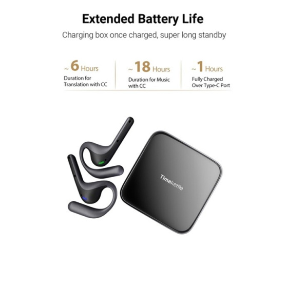 Praktické nabíjecí pouzdro zajišťuje, že budete mít sluchátka vždy připravená k použití. Na jedno nabití vydrží až 6 hodin nepřetržitého tlumočení, takže zvládnete i dlouhá jednání bez přerušení. Pro poslech hudby nabízí až 12 hodin přehrávání. Stylové a kompaktní pouzdro usnadní přenášení i dobíjení kdykoliv na cestách.